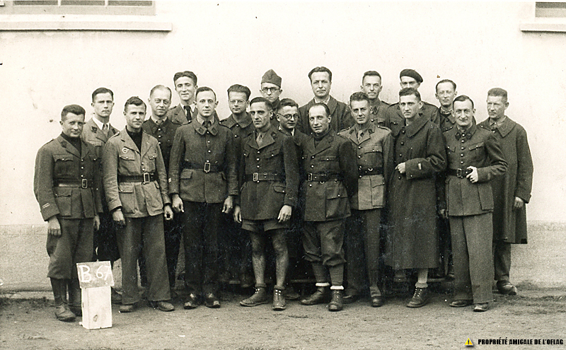 1er rang : 5ème (en retrait derrière ses deux voisins, tête nue et portant des lunettes) : André BERGERON (son Père, le commandant Jean BERGERON, fut prisonnier de l'Oflag XXIB de Schubin), 6ème René DESBOUCHAGES (veste plus claire).