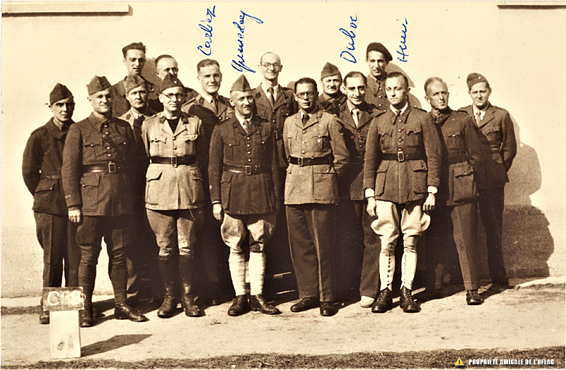 Oflag IIB – Arnswalde : le 3ème debout en partant de la droite est Henry de SANCY (culotte de cheval et guêtres blanches – au-dessus de lui est inscrit son prénom : Henry). Les noms des 15 autres Officiers ne nous sont pas connus à ce jour. Le 4ème en partant de la droite : Hubert DUBOC (médecin) porte une cravate claire et espadrilles blanches. Oflag IIB – Arnswalde : 3. od prawej stoi Henry de SANCY (białe bryczesy i getry - nad nim napisane imię: Henry). Nazwiska pozostałych 15 oficerów nie są nam w tej chwili znane. 4. od prawej: Hubert DUBOC (lekarz) nosi jasny krawat i białe espadryle. Oflag IIB - Arnswalde : the 3rd standing from the right is Henry de SANCY (white riding breeches and gaiters - above him is written his first name : Henry). The names of the other 15 officers are not known to us at this time. The 4th from the right: Hubert DUBOC (doctor) wears a light tie and white espadrilles.