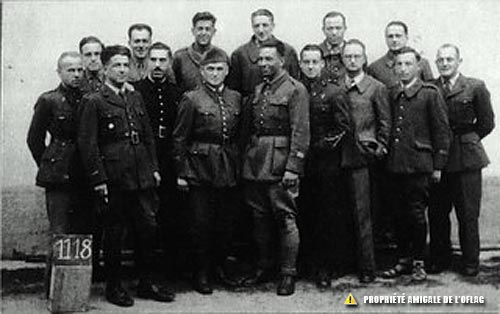 le 4ème en partant de la gauche avec un uniforme foncé est DUPARCMEUR, le dernier à droite, Jean SIMON, Président de l'Amicale de l'Oflag IID-IIB jusqu'en 2005. Le 5ème en partant de la droite est le capitaine (?) Pierre MEILLAND, chef de chambre.