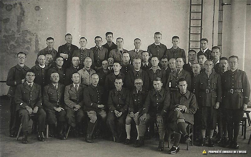 Oflag IIB d'Arnswalde : Chorale Grégorienne : le lieutenant Georges DELLOYE est le 10ème en partant de la gauche dans le 1er rang des officiers debout en retrait derrière d'autres officiers. Le 1er officier assis en partant de la gauche est le lieutenant Jean PEYRONNET qui fut président de l'Amicale de l'Oflag IID-IIB-XXIB. Photo prise dans la Turnhalle