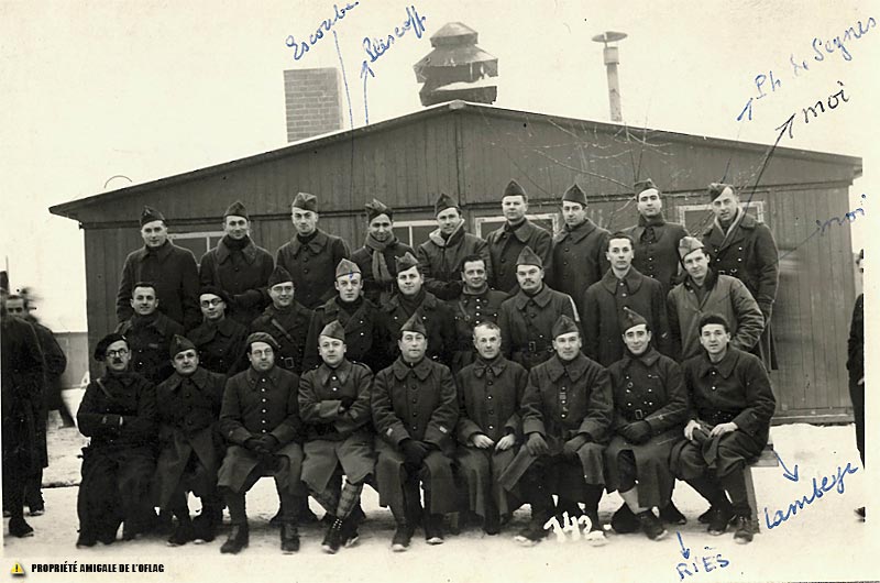 Gross-Born - Oflag IID : 1er rang et 1er en partant de la droite : LAMBEYE ? - 2ème : Riès ?. 2ème rang et 4ème en partant de la gauche : ESCOUBE Pierre - dernier à droite : Guy de MIRAMON (moi). 3ème et dernier rang : le 4ème en partant de la gauche : PLESCOFF Georges - le dernier à droite : de SEYNES Philippe. |