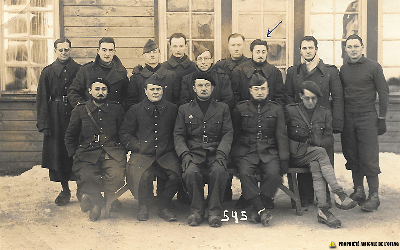 Oflag IID – Gross-Born : le lieutenant France MERCIER est au second rang des Officiers debout, le 3ème en partant de la droite. Les noms des 13 autres prisonniers de ce groupe ne nous sont pas connus. Photo datant de janvier 1942.