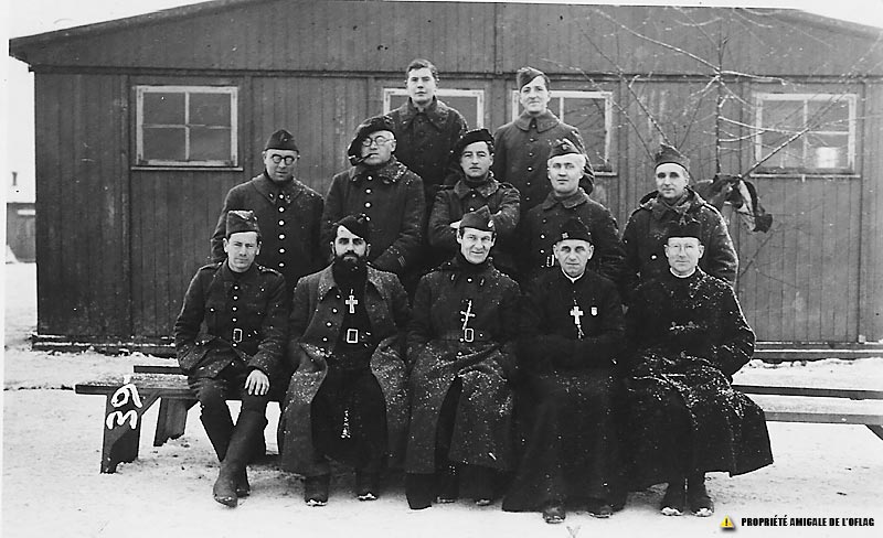 Oflag IID - Gross-Born : un groupe de prisonniers dont au moins 4 prêtres au 1er rang. Le second assis en partant de la droite est le Père Henri DUPAQUIER, curé de Moutiers Saint-Jean (Côte d'Or), et curé de la paroisse Saint-Pierre aux Liens, nom donné à la paroisse de l'Oflag IID Durant toute la captivité. |