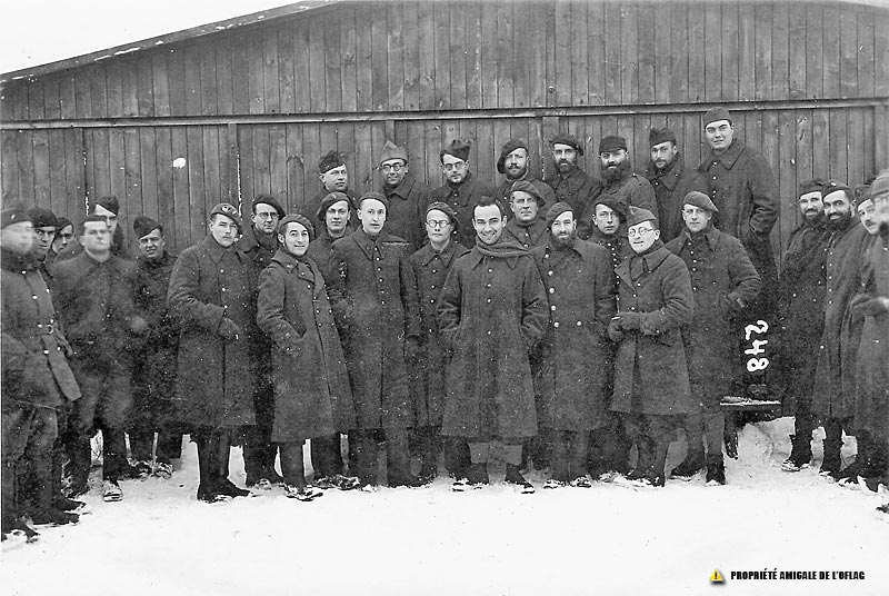 Oflag IID – Gross-Born : Dernier rang des offiers montés sur un banc : Le lieutenant René MARTIN est le 1er en partant de la droite ( le plus grand). Les noms des autres Officiers présents sur cette photo ne sont pas connus.