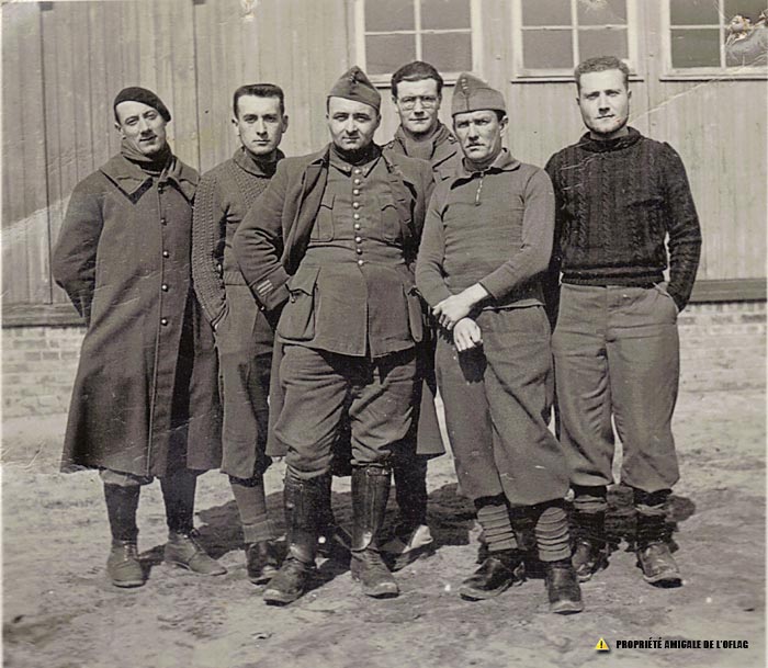 Oficerowie,wśród których stoi kapitan Ludovic AGNES z bloku 2 - baraku 5 - pokoju 3, w furażerce i butach z cholewą. |