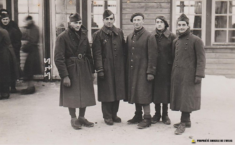 Oflag IID – Gross-Born : Robert PLOYE est au milieu et à sa gauche se trouve Jacques CROIZIER. Les noms des 3 autres prisonniers de ce groupe ne nous sont pas connus.