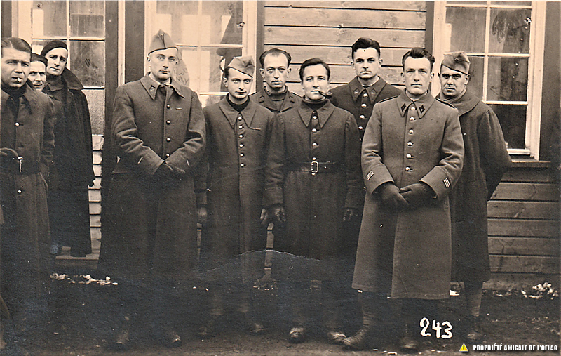Oflag IID – Gross-Born : en partant de la droite : le 1er est le s/Lt. VINCENT – le 2ème est le Capitaine Maurice LESAINT (tête nue, mains gantées assemblées) – le 3ème est Gabriel LABADIE - le 4ème est le lieutenant MORA (pipe) - le 6ème est le Lieutenant Jacques DANRÉE.