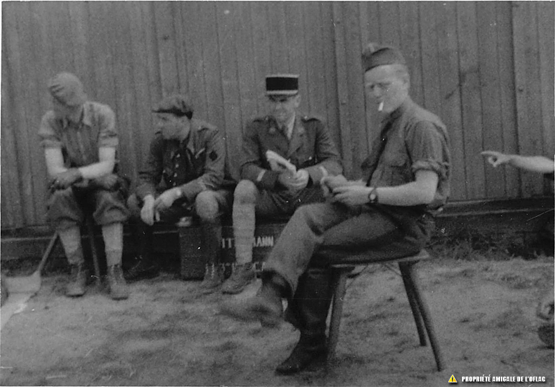 Oflag IID – Gross-Born : ces Officiers prisonniers ne sont pas identifiés. Toutefois le 2ème en partant de la gauche serait Albert BOYER et le 1er à droite avec le képi serait Jacques FITREMANN. Oflag IID – Gross-Born : ci oficerowie więźniowie nie są identyfikowani. Jednak 2. z lewej byłby Albert BOYER, a 1. z kepi byłby Jacques FITREMANN.