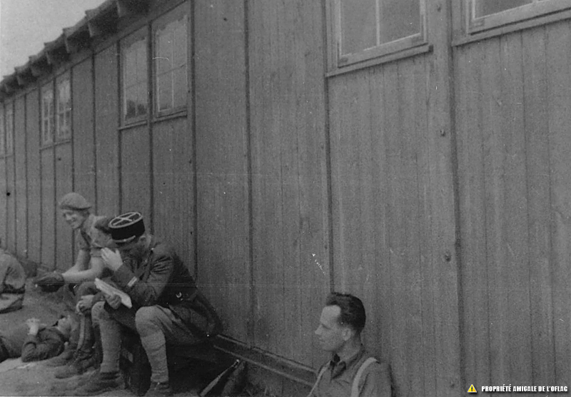 Oflag IID – Gross-Born : ces Officiers prisonniers ne sont pas identifiés. Toutefois celui qui porte sa main à son képi serait Jacques FITREMANN et le suivant avec un béret Albert BOYER. Oflag IID – Gross-Born : ci oficerowie więźniowie nie są identyfikowani. Jednak tym, który przyniesie rękę do kepi, będzie Jacques FITREMANN, a następny beret Albert BOYER.