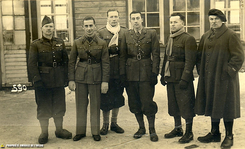 Oflag IID – Gross-Born : le 2ème en partant de la gauche est Maurice MARCHAND. Les 5 autres Officiers ne sont pas identifiés à ce jour. Oflag IID - Gross-Born : 2. od lewej Maurice MARCHAND. Pięciu pozostałych funkcjonariuszy nie zostało dotychczas zidentyfikowanych.