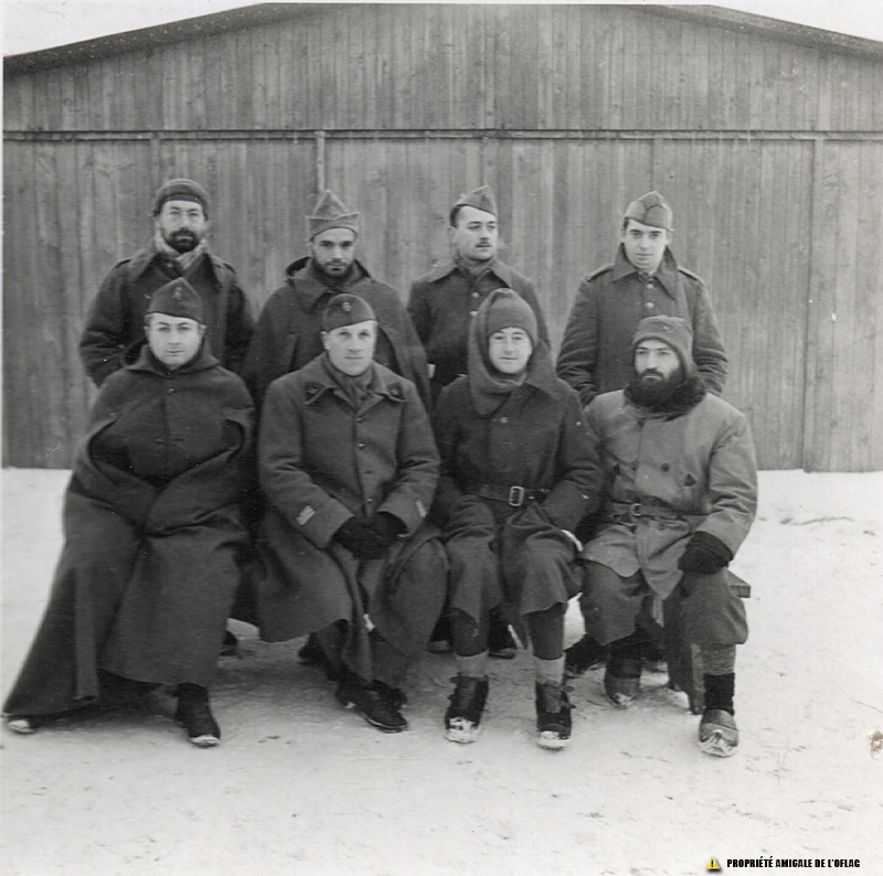 Oflag IID – Gross-Born : Dans ce groupe de 8 Officiers, le seul identifié est le 1er à droite au second rang : Lieutenant Albert MOUISSET. Oflag IID - Gross-Born : In this group of 8 officers, the only one identified is the 1st on the right in the second row : Lieutenant Albert MOUISSET.