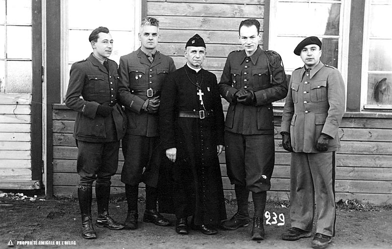 Oflag IID – Gross-Born : René OUSSET est le 1er à droite. Le prêtre, qui n'est autre que le célèbre et très aimé Père DUPAQUIER, ancien de 14-18 qui, au moment d'être rapatrié en France, a voulu rester dans " SA " paroisse qu'était pour lui l'Oflag IID. L'homme à la gauche du père DUPAQUIER