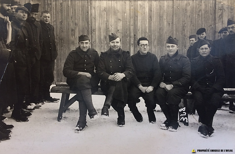 Oflag IID - Gross-Born : Le Sergent-Chef Yves GUILLOT est assis au centre de ce groupe de 5 prisonniers (tête nue et lunettes). Dans le site, rubrique « LES CAMPS », sous-rubrique « L'ORGANISATION » on peut lire un très intéressant article d'Yves GUILLOT intitulé « LA POSTE A L'OFLAG IID-IIB ». Les 9 autres prisonniers présents de chaque côté sur cette photo, (« qui attendent leur tour pour être photographiés »), ne sont pas connus à ce jour.