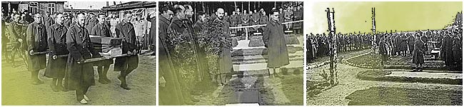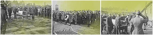 | Vue extérieure sud de l'oflag IID. Le cortège funèbre. Photo donnée par Monsieur Darius CZERNIAWSKI de Borne Sulinowo. | La haie d'honneur. Photo donnée par Monsieur Darius CZERNIAWSKI de Borne Sulinowo. | Mise en terre du lieutenant Maurice BOSQUIER dans le petit cimetière de l'oflag IID au sud-ouest du camp. Photo donnée par Monsieur Darius CZERNIAWSKI de Borne Sulinowo. |