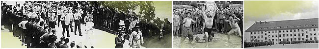 | Oflag IIB d'Arnswalde : Kermesse à Gross-Born - août 1941. Concours de pêche 20 juin 1943 - Fanfare devant les blocs III et IV. |