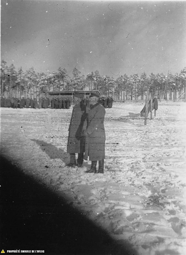 Oflag IID – Gross-Born : appel sous la neige. On distingue un officier allemand et le chef français de l'Oflag IID, le plus ancien dans le grade le plus élevé. Oflag IID – Gross-Born: zadzwoń pod śnieg. Jest niemiecki oficer i francuski szef Oflagu IID, najstarszy w najwyższej randze. |
