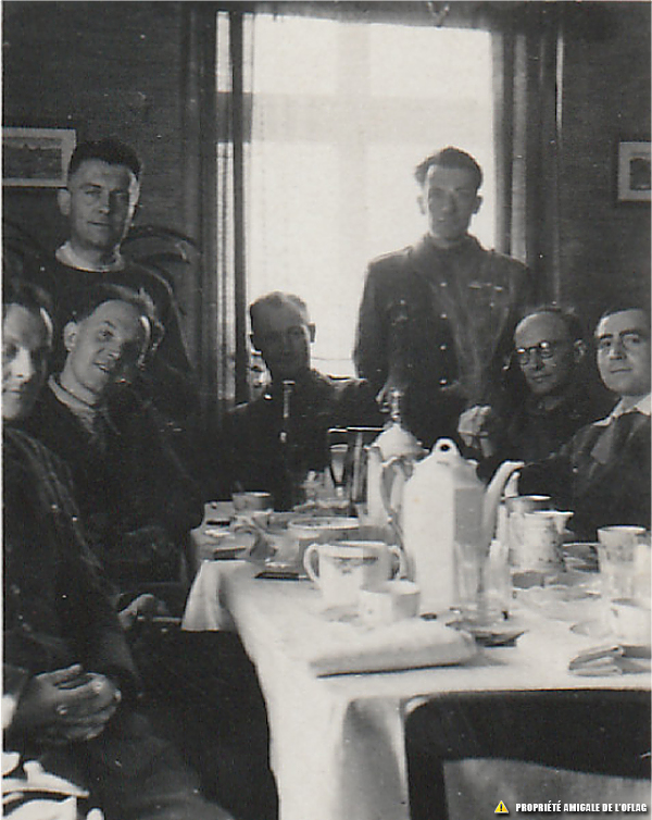 Le Capitaine Maurice LESAINT est debout devant la fenêtre. Les noms des 6 autres Officiers ne nous sont pas connus. Cette photo est prise à l'intérieur d'une habitation civile allemande dont les habitants avaient été chassés par l'armée Britannique après la découverte du camp de concentration de Bergen-Belsen proche de la ville de Bergen. Kapitan Maurice LESAINT stoi przed oknem. Nazwiska pozostałych 6 oficerów nie są nam znane. To zdjęcie zostało zrobione w niemieckim cywilnym mieszkaniu, którego mieszkańcy zostali wypędzeni przez armię brytyjską po odkryciu obozu koncentracyjnego Bergen-Belsen w pobliżu miasta Bergen.