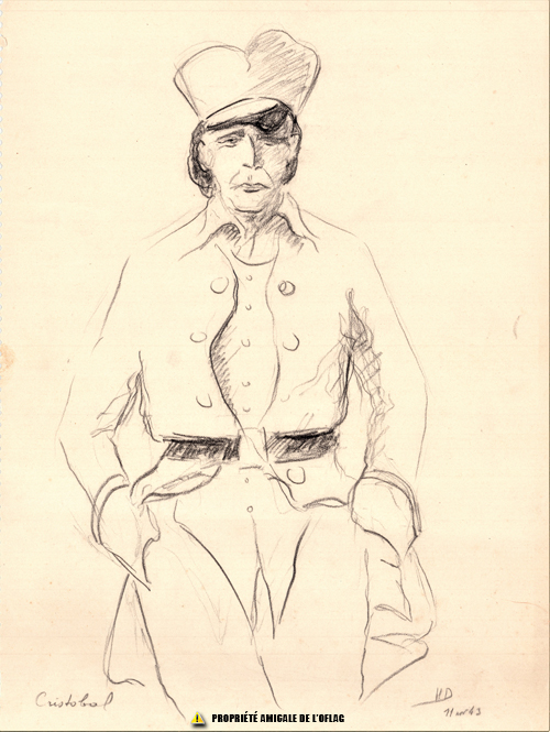 Lieutenant Roger BOUCHERON – « Souvenir du corsaire » signé « Cristobal - 11 nov 43 - IID ». La date peut indiquer que le dessin a en fait été réalisé à l'Oflag IIB, car en 1943 les prisonniers s'y trouvaient depuis mi-mai 1942. Il représente Roger BOUCHERON dans un rôle qu'il a en fait peut-être joué à l'Oflag IID ? Porucznik Roger BOUCHERON - "Souvenir du corsaire" podpisany "Cristobal - 11 Nov 43 - IID". Data może wskazywać, że rysunek został faktycznie wykonany w Oflagu IIB, gdyż w 1943 r. więźniowie przebywali tam od połowy maja 1942 r. Przedstawia Rogera BOUCHERONA w roli, którą mógł rzeczywiście odegrać w Oflagu IID ? Lieutenant Roger BOUCHERON - 'Souvenir du corsaire' signed 'Cristobal - 11 Nov 43 - IID'. The date may indicate that the drawing was in fact made in Oflag IIB, because in 1943 the prisoners had been there since mid-May 1942. It represents Roger BOUCHERON in a role that he may have actually played in Oflag IID ?