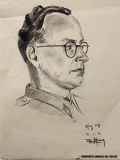 Oflag IID – Gross-Born : dessin représentant Pierre REVOL, membre de l’équipe des évadés du tunnel tragique du 18 mars 1942. Oflag IID - Gross-Born : rysunek przedstawiający Pierre'a REVOLA, członka ekipy uciekinierów z tragicznego tunelu z 18 marca 1942 r. Oflag IID - Gross-Born : drawing showing Pierre REVOL, a member of the team of escapees from the tragic tunnel of 18 March 1942.