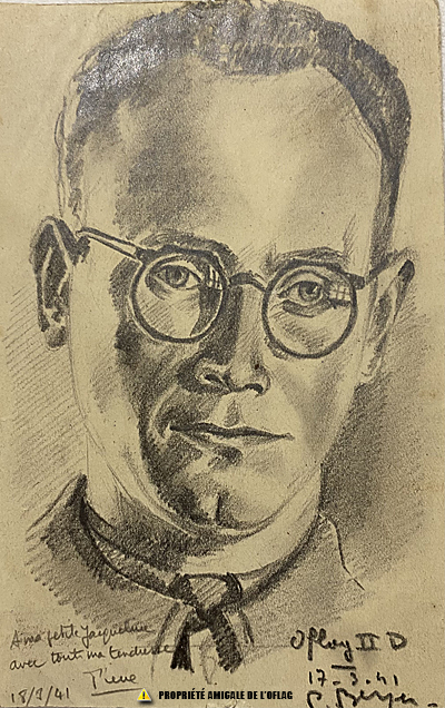 Oflag IID – Gross-Born : dessin représentant Pierre REVOL, membre de l'équipe des évadés du tunnel tragique du 18 mars 1942. Oflag IID - Gross-Born : rysunek przedstawiający Pierre'a REVOLA, członka ekipy uciekinierów z tragicznego tunelu z 18 marca 1942 r. Oflag IID - Gross-Born : drawing showing Pierre REVOL, a member of the team of escapees from the tragic tunnel of 18 March 1942.