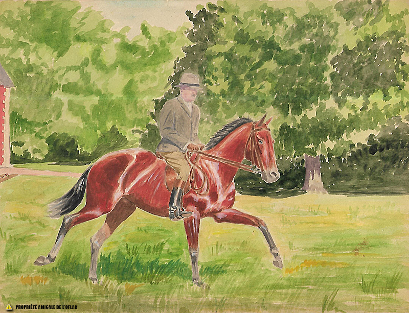 Oflag IID : « Gross-Born - Lucien de SANCY (père d'Henri de SANCY) à cheval à Janville » aquarelle peut-être réalisée par Henri de SANCY ? Oflag IID : "Gross-Born - Lucien de SANCY (ojciec Henri de SANCY) na koniu w Janville" akwarela być może autorstwa Henri de SANCY ? Oflag IID : "Gross-Born - Lucien de SANCY (father of Henri de SANCY) on horseback at Janville" watercolour perhaps by Henri de SANCY?