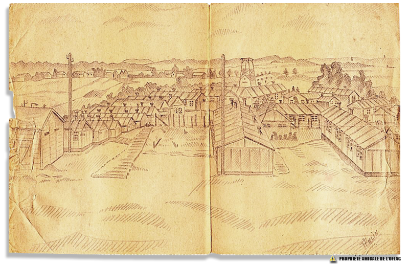 Vue au premier plan sur le block II de l'Oflag IID de Gross-Born avec au fond le block III dont la baraque 12 est indiquée.
