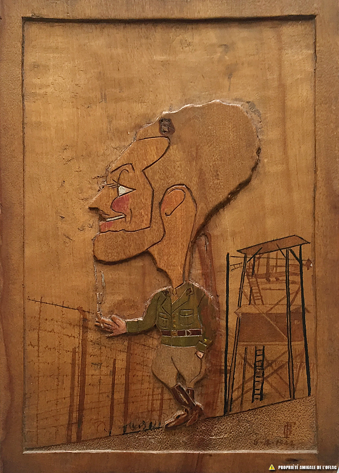 Oflag IID – Gross-Born : Caricature sur bois du lieutenant France MERCIER datée du 5 avril 1942. Les initiales entrelacées de son auteur sont « GF » ou « FG ». France MERCIER se produisait comme prestidigitateur sur les scènes de théâtres parisiens, en première partie, avant la guerre, lorsqu'il était étudiant, pour se faire de l'argent de poche.