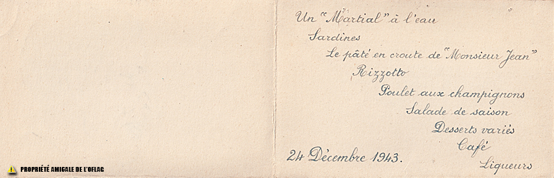 Drawing of the menu for the Christmas meal of Second Lieutenant Evariste LEMAIRE, 24 December 1943.
