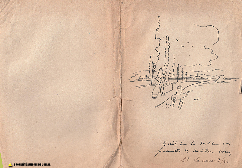 Dessin menu du repas du 31 décembre 1942 du Lieutenant Evariste LEMAIRE : « Ecrit sur le Sable vous présente ses meilleurs vœux ». Drawing of the menu of the meal of December 31, 1942 of Lieutenant Evariste LEMAIRE: "Ecrit sur le Sable presents you its best wishes".