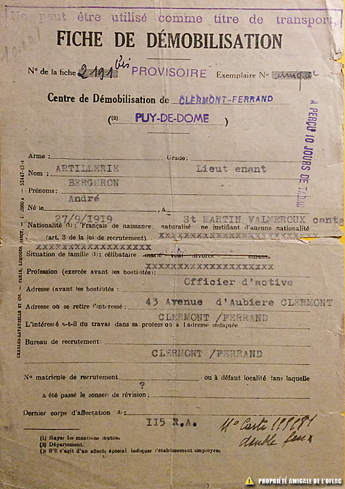 Fiche de démobilisation du lieutenant André BERGERON page 1