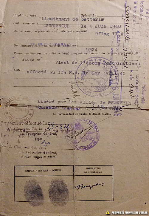 Fiche de démobilisation du lieutenant André BERGERON page 2