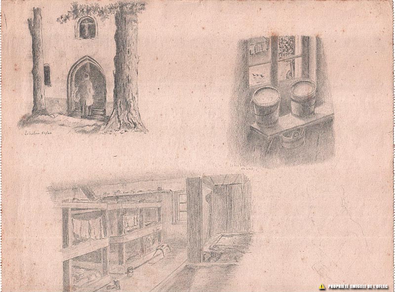 Oflag XXIB – Schubin : entrée de la chapelle, intéieur d'un baraquement et les seaux d'eau - décembre 1941.