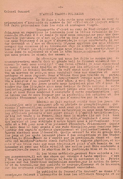 Article by colonel Gonnard, head of the 354 French prisoner officers who arrived in June 1940 at Oflag IIB where they remained until 8 November 1940.