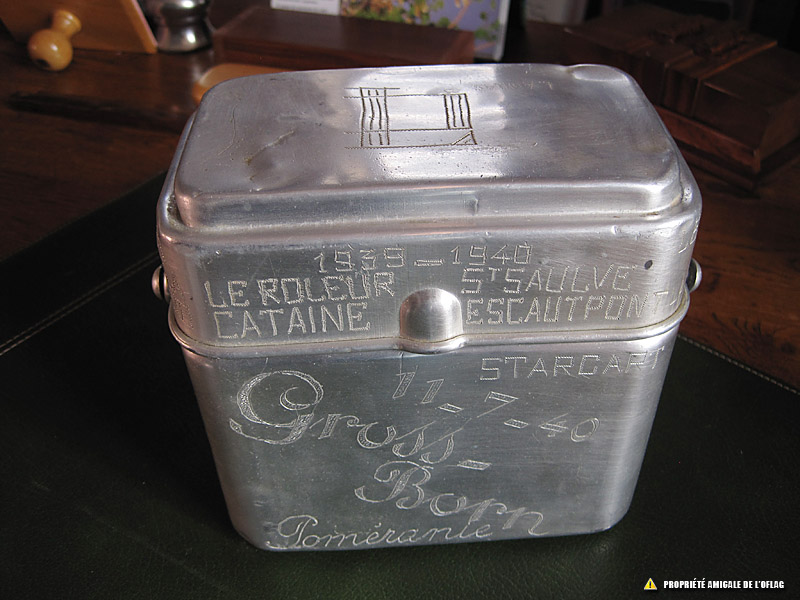 Gamelle fabriquée par le lieutenant Daniel LANDAS. Elle reprend les noms des étapes durant la période de guerre 1939-1940 puis les villes conduisant au camp de Gross-Born, lieu de sa captivité de 1940 à mai 1942.