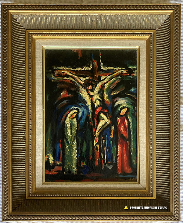 Christ en croix : peinture réalisée par Henri CLAUZON à l'Oflag IID ou à l'Oflag IIB ? (28 cm de haut – 18 cm de large). Chrystus na krzyżu : namalowany przez Henri CLAUZONA w Oflagu IID lub Oflagu IIB (28 cm wysokości - 18 cm szerokości). Christ on the Cross : painted by Henri CLAUZON in Oflag IID or Oflag IIB (28 cm high - 18 cm wide).