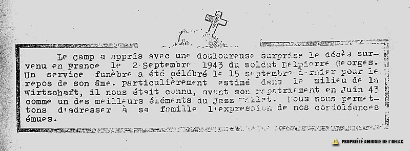 Faire-part de décès du Soldat Georges DELPIERRE paru dans le journal des prisonniers, "Ecrit sur le Sable", le n° 35 du 26 septembre 1943.