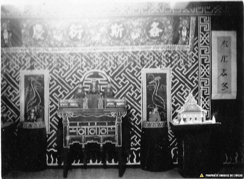 Tenture rouge et or - Autel de Bouddah. A droite maquette d'une pagoda cambodgienne.