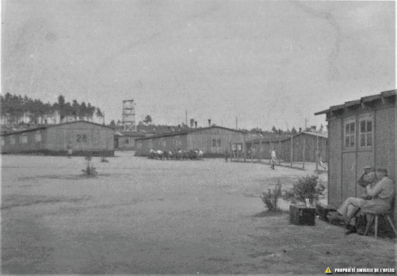 Oflag IID – Gross-Born : une vue du camp vers le nord. On voit les « baraques 28 et 29 » du « Block 1 » et entre elles et derrière la « baraque 31 » et puis loin encore un mirador. Oflag IID – Gross-Born : widok na obóz na północy. Widzimy "koszary 28 i 29" z "Bloku 1" i między nimi i za "barakiem 31", a następnie daleko znowu wieżę strażniczą.