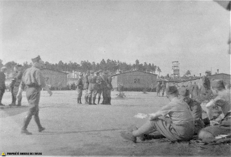 Oflag IID – Gross-Born : une vue du camp vers le nord avec de nombreux prisonniers français. On voit les « baraques 27 et 28 » du « Block 1 ». Oflag IID – Gross-Born : widok na obóz na północy z wieloma francuskimi więźniami. Widzimy "koszary 27 i 28" z "Bloku 1".
