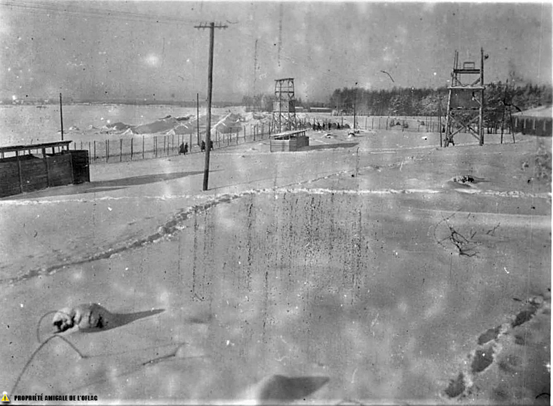 Oflag IID – Gross-Born : Vue de l'angle sud-ouest du camp direction le village de Rederitz. La baraque que l'on voit à droite est la « baraque A » du « nouveau Block 4 ». Un peu au-delà se situait le cimetière où furent inhumés plusieurs Officiers français.