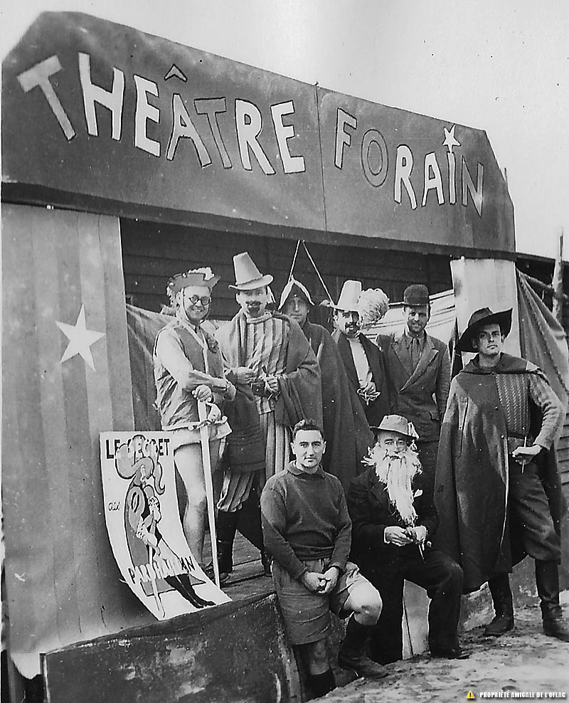 Oflag IID - Gross-Born : teatr jarmarczny: w repertuarze "tajemnica Pardaillanów". Aktor po lewej w okularach to André BERGERON.