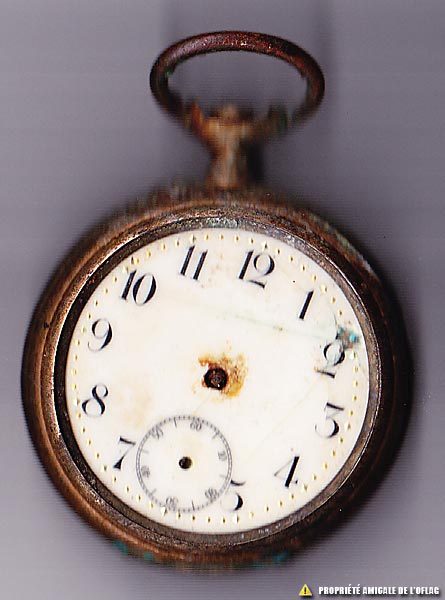 ![]() Gross-Born Oflag IID montre française. Elle a été retrouvée par Tomasz SKOWRONEK, Ingénieur de l’Office National des Forêts Polonais dans le sable de ce qui fut le camp et donnée au secrétaire général de l’Amicale Française de l’Oflag IID-IIB en juin 2003 |