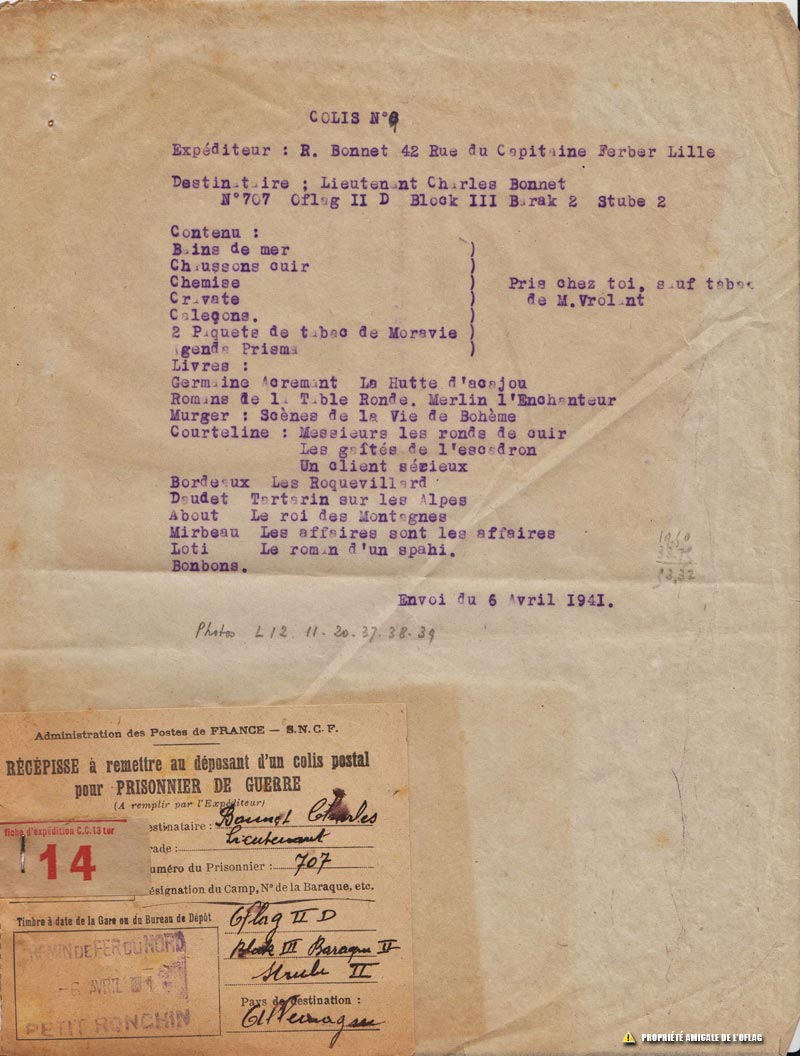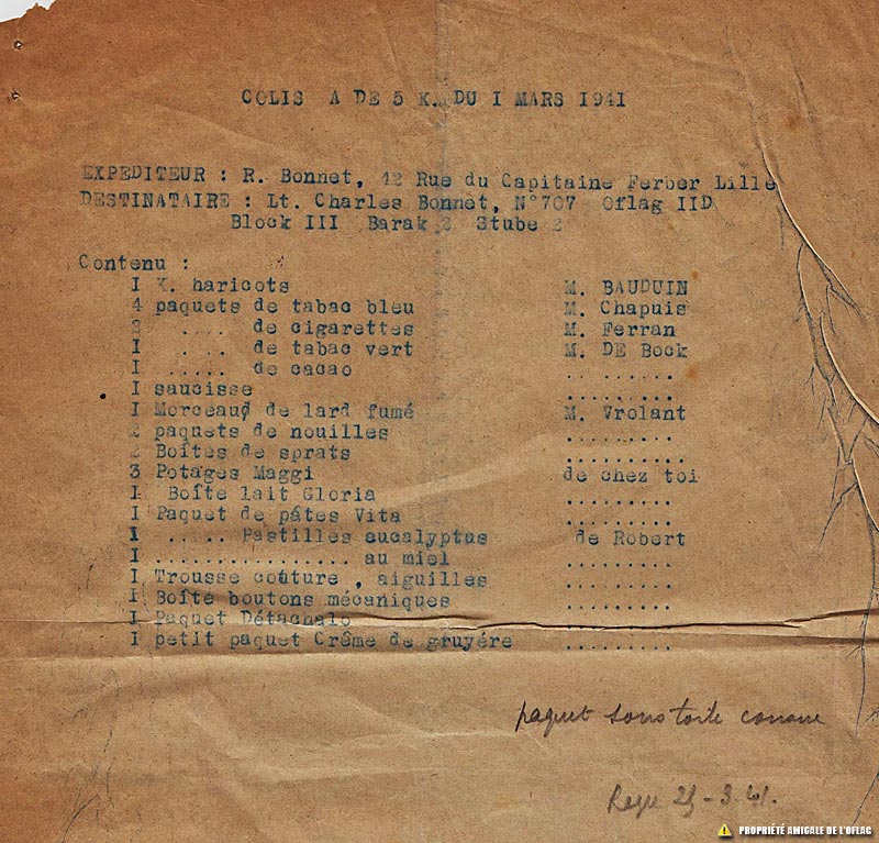 Exemple d'inventaire de colis reçu par le Lieutenant Charles BONNET – Oflag IID – Bloc III - Baraque 2 – Stube 2. Example of an inventory of a parcel received by Lieutenant Charles BONNET - Oflag IID - Block III - Barrack 2 - Stube 2. Dariusz CZERNIAWSKI Archives - Sulinow Terminal - Poland |