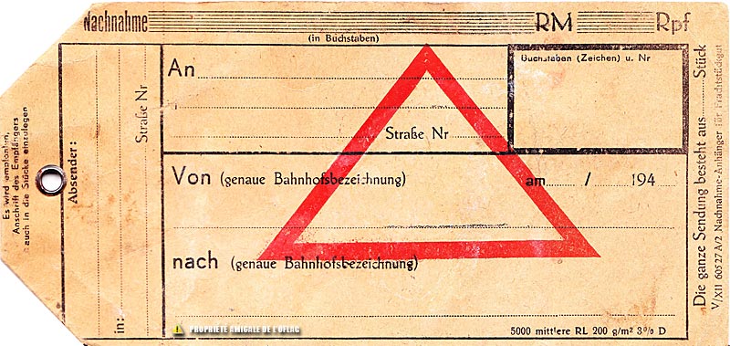 Etiquette (recto) officielle qui accompagne un colis envoyé par un prisonnier de l'Oflag IID, le lieutenant Georges GRESSET – matricule 225, à une personne qui fut prisonnier dans le même camp, Monsieur Maurice HIRET, sans doute rapatrié en France à la date (non connue) de l'envoi du colis. Monsieur GRESSET ne figure pas dans l'annuaire de 1946 de l'amicale qui contient 4200 noms. Monsieur HIRET y figure bien. Official label (front and back) accompanying a parcel sent by a prisoner of Oflag IID, Lieutenant Georges GRESSET - number 225, to a person who was a prisoner in the same camp, Mr Maurice HIRET, who was probably repatriated to France at the date (not known) of the sending of the parcel. Mr GRESSET does not appear in the 1946 directory of the amicale which contains 4200 names. Mr HIRET does appear in it. |