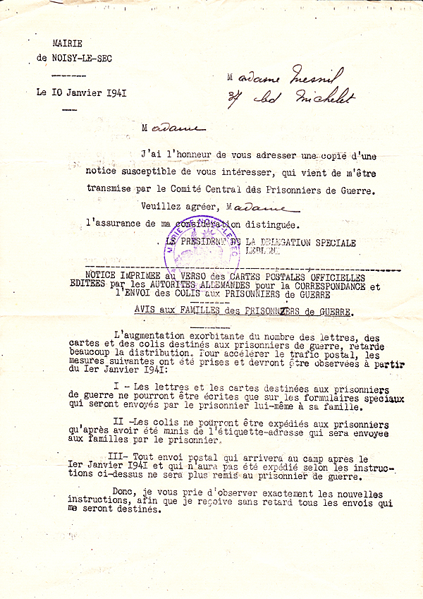 Notice d’information pour les envois de lettres et colis à un prisonnier de l’oflag IID s’appliquant à partir du 1er Janvier 1941.