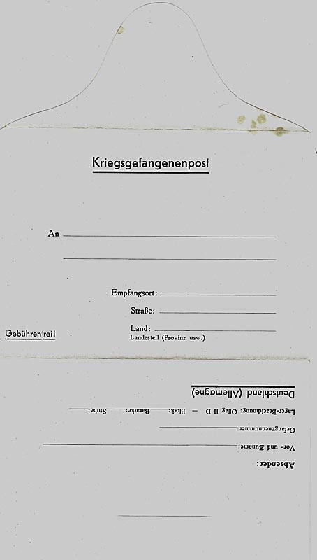 Modèle de lettre qui passait obligatoirement par le service allemand de censure (geprüft). Model letter that had to pass through the German censorship service (geprüft). It can be seen that the sealing system did not allow the letter to be sealed. The prisoner had to write down, in addition to his name and surname, his prisoner number - the number of his block (block), - the number of his barrack, the number of his room (Stube). The part "where the prisoner wrote" measures 28.5 cms by 14.7 cms. The writing had to be done with a pencil. During captivity, many prisoners wrote smaller and smaller letters in order to write as much as possible, the number of letters being restricted.