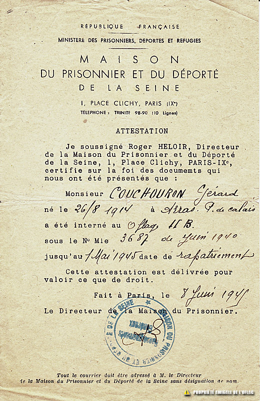Attestation officielle de captivité du Lieutenant Gérard COUCHOURON