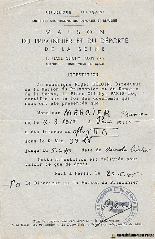 Attestation de la Maison du Prisonnier et du Déporté de la seine » pour la captivité de France MERCIER.
