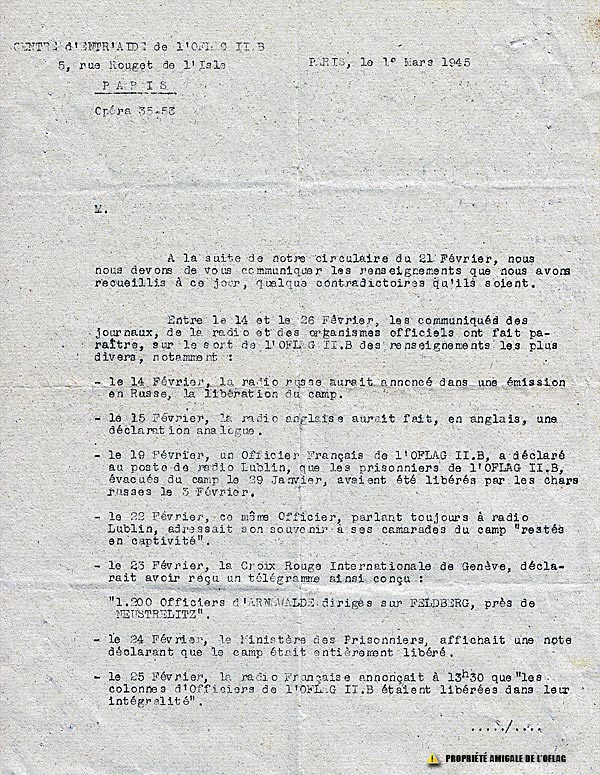 Recto de la circulaire n°2 du Centre d'Entraide de l'Oflag IIB datée du 1er mars 1945, donnant des nouvelles des prisonniers de ce camp.