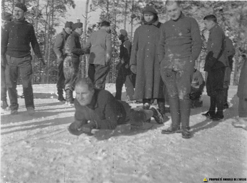 Oflag IID – Gross-Born : Les prisonniers ont pu « fabriquer » des luges qui leur permettent de profiter de la déclivité de la « teufelheide », la « lande du diable », lieu-dit sur lequel l'Oflag IID est bâti. Oflag IID – Gross-Born : mecz piłki nożnej na zaśnieżonym boisku sportowym "Bloku 1".